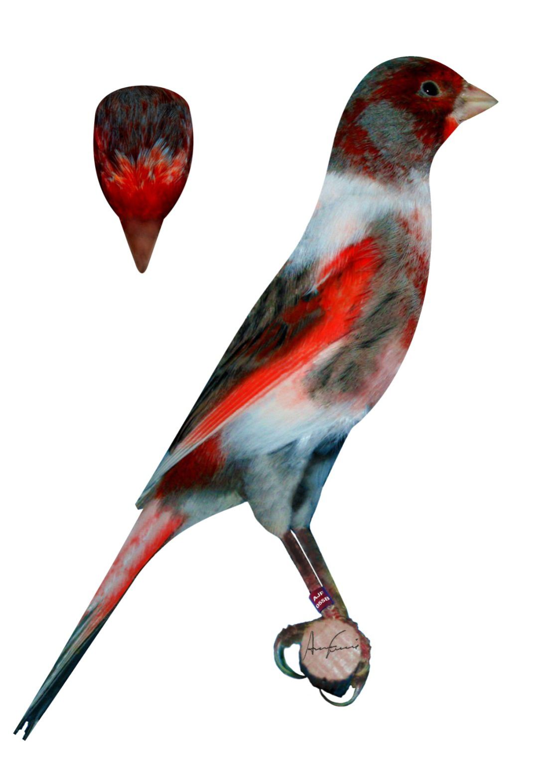 Equilibradamente variegada (melanina / lipocromo) com presença de lipocromo vermelho vivo nas zonas características do factor mosaico. O dimorfismo sexual resultante caracteriza-se por uma extensão superior de lipocromo vermelho nos machos em relação às fêmeas.