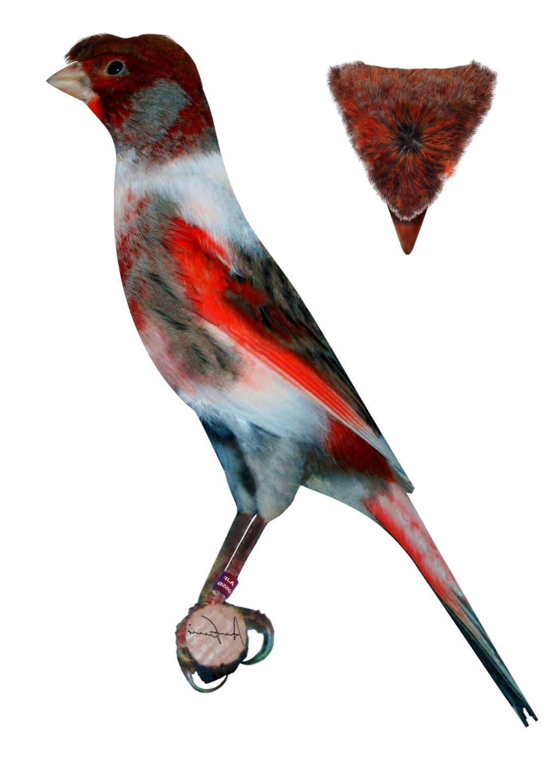 Poupa (no Arlequim Poupa) – em forma triangular (2 ângulos atrás e 1 virtual à frente) irradiando de um ponto central no cimo da calota e descaindo aderente e simetricamente, sem cobrir olhos e bico.